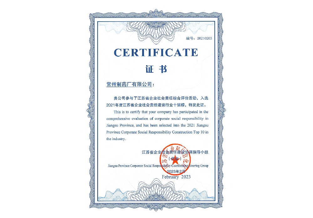 江蘇省企業(yè)社會責任建設十強證書