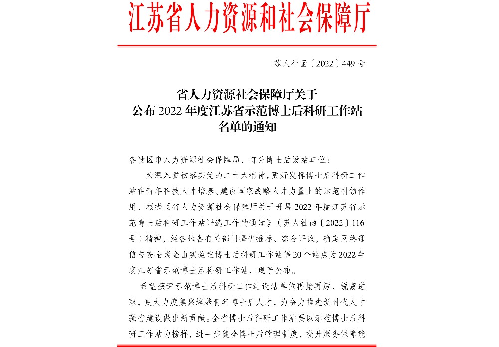 關于公布 2022 年度江蘇省示范博士后科研工作站名單的通知